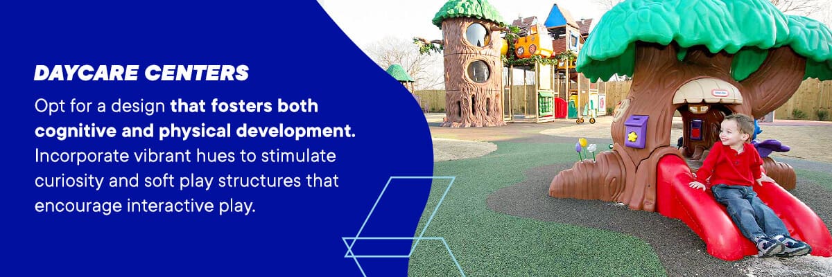 Daycare centers are the ideal places for playgrounds. The playground design style for these spaces should align with the spirit of growth and exploration. Opt for a design that fosters both cognitive and physical development. Incorporate vibrant hues to stimulate curiosity and soft play structures that encourage interactive play. Consider incorporating educational elements within the design — a playful combination of learning and joy.