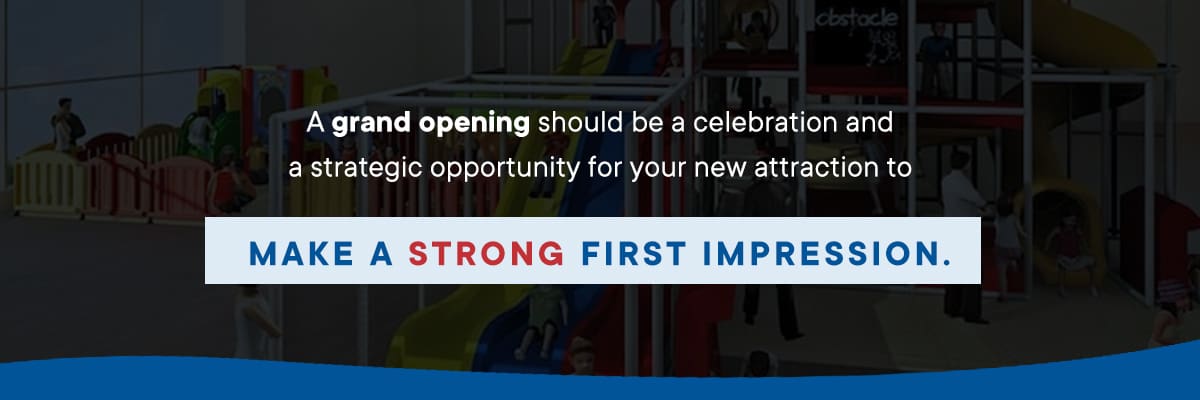 Make your grand opening an official park event. After weeks or months of detailed planning and careful consideration, opening day is your opportunity to see how your hard work paid off. A grand opening should be a celebration and a strategic opportunity for your new attraction to make a strong first impression.