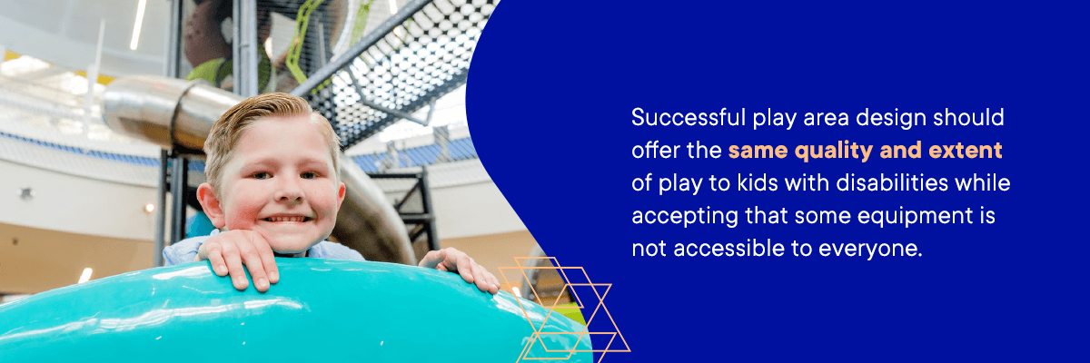- Usability: Kids should be able to move around the play area and reach the play equipment. Incorporate equipment designs that provide play and spaciousness for body sizes, abilities positions and assistive devices.