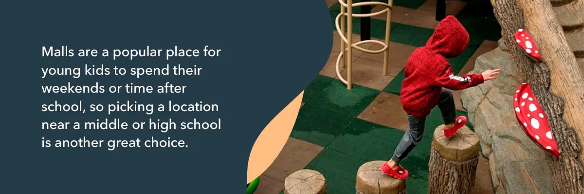 Think about the demographics that shop in different areas, too. A playground will work well by kids clothing stores or toy stores, while an arcade suits stores geared toward adults and teenagers.