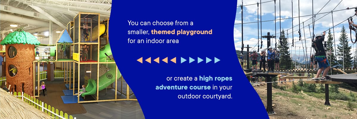 Because every playground is unique, you can choose from a smaller, themed playground for an indoor area or create a high ropes adventure course in your outdoor courtyard. Kids will love the opportunity to climb, slide, navigate a ropes course and enjoy other activities within the playground.