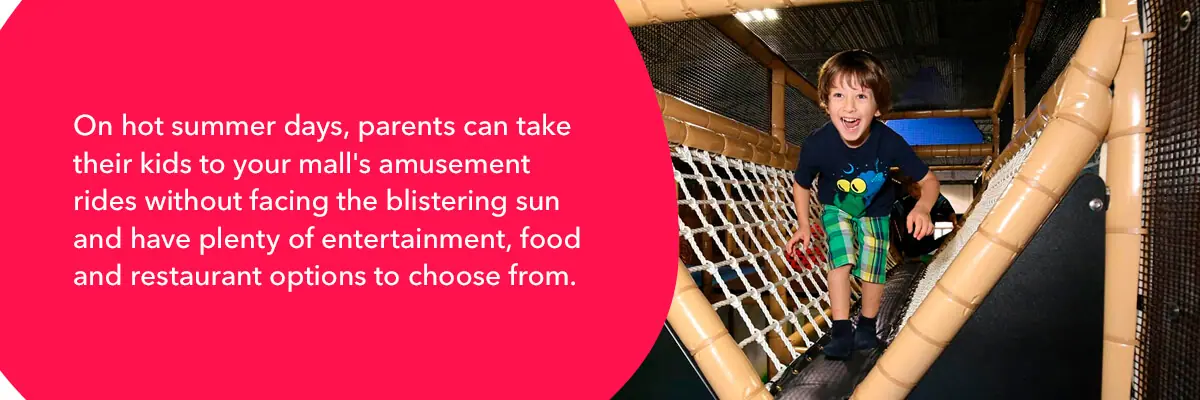 Indoor amusement parks are a great way to attract families to your mall. On hot summer days, parents can take their kids to your mall’s amusement rides without facing the blistering sun and have plenty of entertainment, food and restaurant options to choose from.